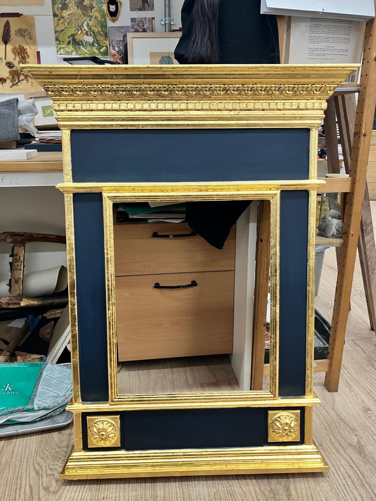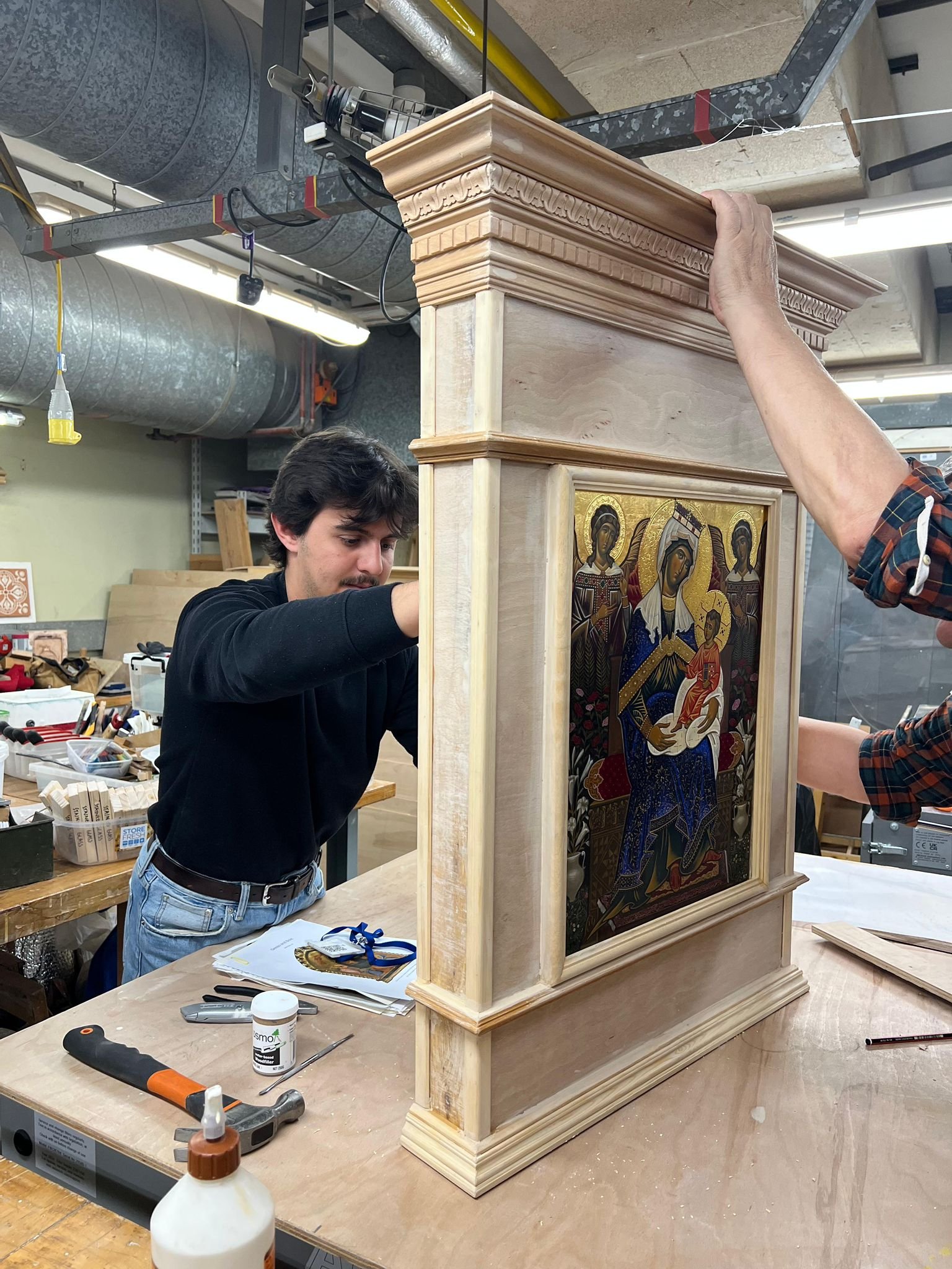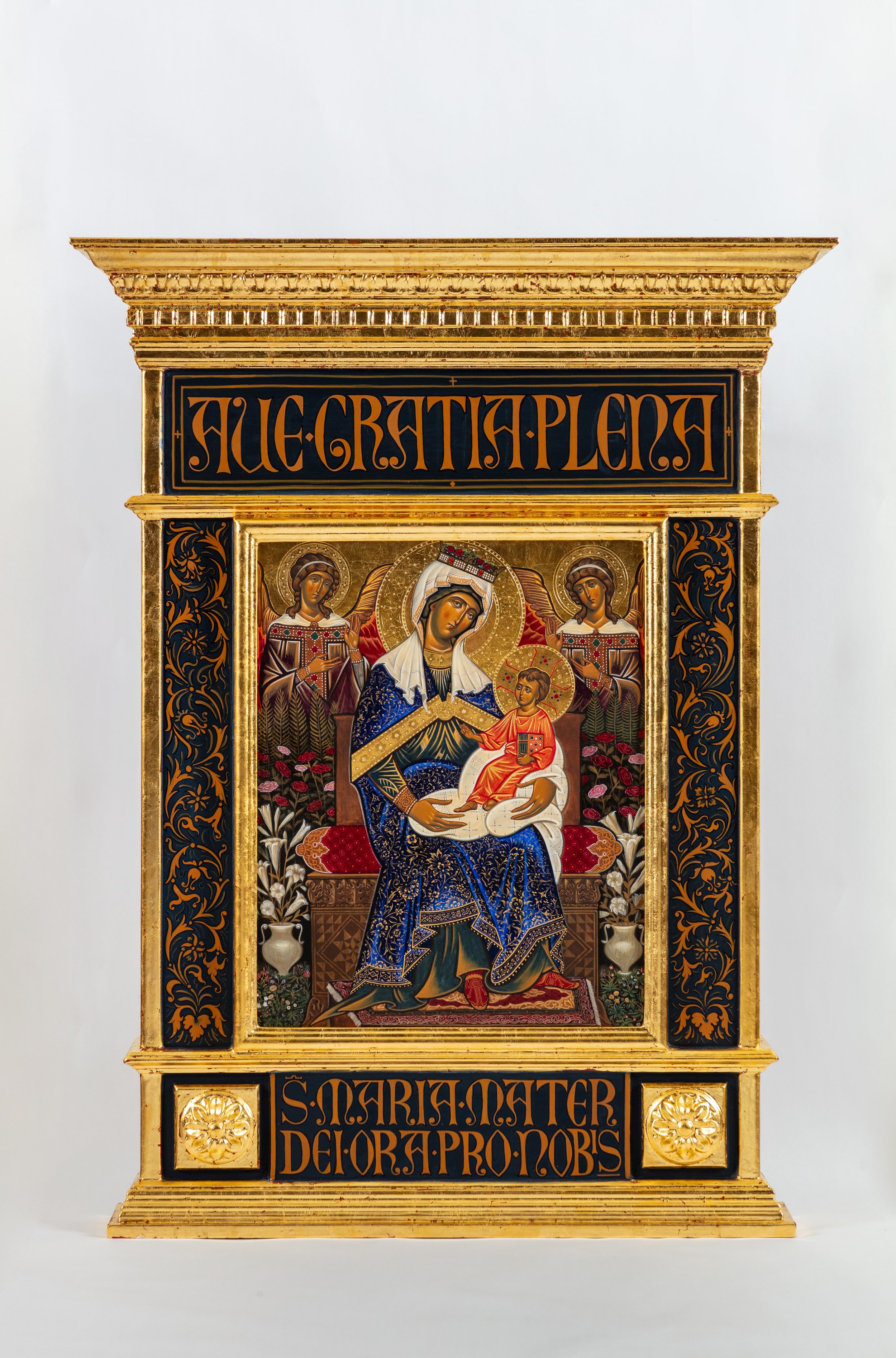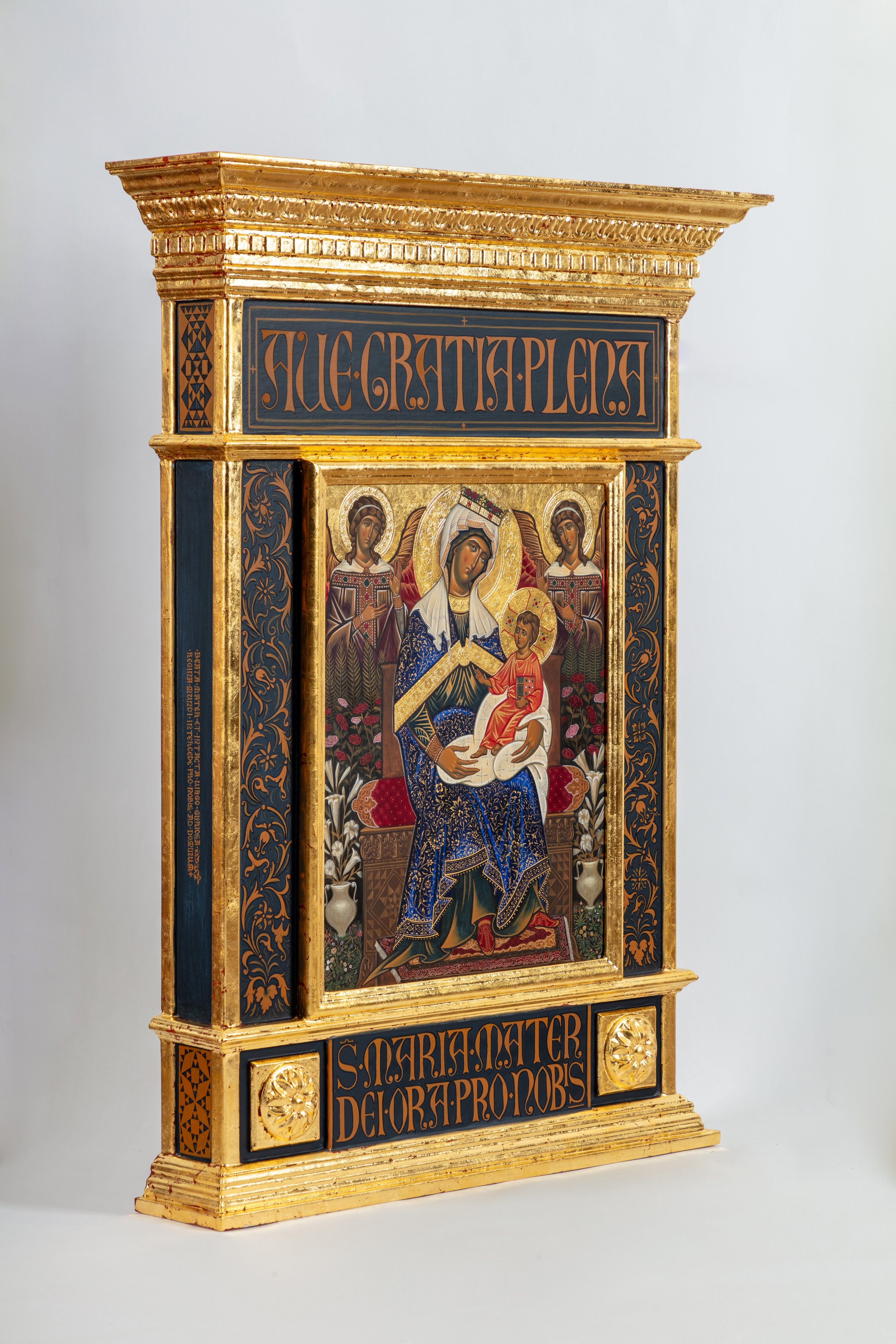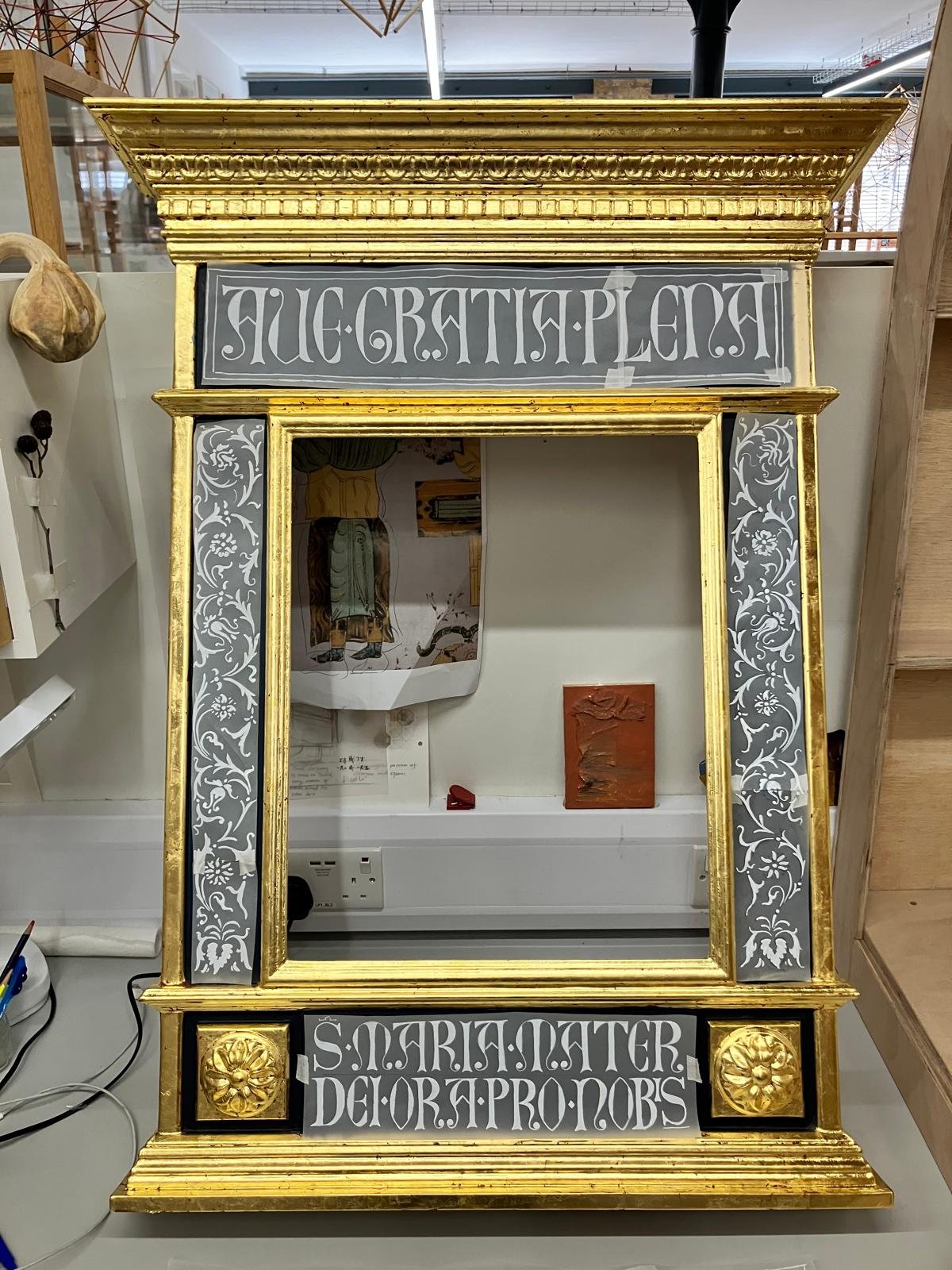 For my second year thesis project, I set out to reconstruct an altarpiece in the style of the Tuscan Masters of Medieval Italy. In researching the painting and craft techniques of the period I was able to recreate the process as was described and executed by the masters of the time to produce a gilded icon, painted with egg tempera and mounted in an aedicule style frame which was created using historical examples as reference.